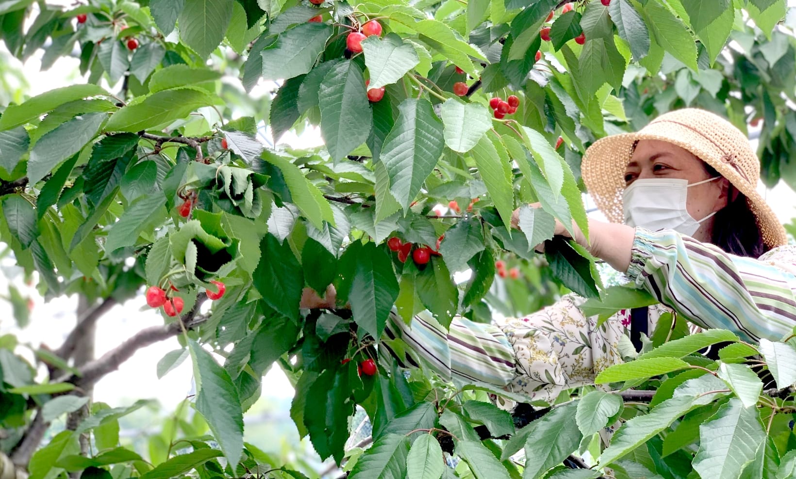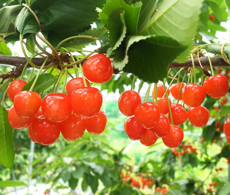 「正光錦」が6月上旬〜中旬で一番早い収穫で、優しい甘みと美しい色が特徴です。次に6月中から下旬にかけて「香夏錦」「佐藤錦」が実ります。「香夏錦」は身が柔らかく大粒なのが特徴で、プレザーブスタイルのジャムは、お口の中でとろける食感をお楽しみ頂けます。王道の「佐藤錦」は大変甘みが高く、当園では糖度が30度近くなります。
